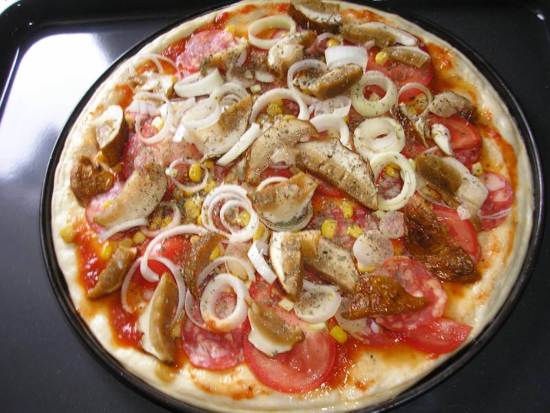 A tészta hozzávalóit géppel összedolgozzuk, hogy lágy tésztánk legyen. Előbb kevesebb vizet, és utána adagoljuk még szükség szerint. A sima tésztát rövid időn belül kettévesszük, ugyanis a gyors élesztővel gyorsan megkel, ha meleg helyre tesszük. Tehát kétfelé osszuk a tésztát, és kézzel széthúzzuk, akár a rétest, és belehelyezzük a pizzaformába, de előtte olivaolajjal kenjük meg. Kis peremet is nyomjunk a szélükre, és hagyjuk pihenni 5 percig. Szurkáljuk meg villával a tésztákat, hogy ne púposodjanak fel. Ezután jöhet a feltét. Bolognese mártással kenjük meg. Ezután terítsünk rá felkarikázott póréhagymát, meg fokhagymát. Angolszalonnát csíkokra vágunk, és azt is rárakjuk. Majd következik az erős zöldpaprika, szintén csíkokra vágjuk. Ezután karikára vagdalt füstölt kolbász kerül, persze nem túl sok, csak amennyit az ízlés kívánja. Vargányagombát nagy szeletekre vágva kerül még rá, majd erre rászórunk egy jókora adag reszelt mozzarella sajtot. 180 fokos sütőbe 200 fokon megsütjük. Légkeverékesben az alsó sütő is lehet bekapcsolva, hogy átsüljön kellően.